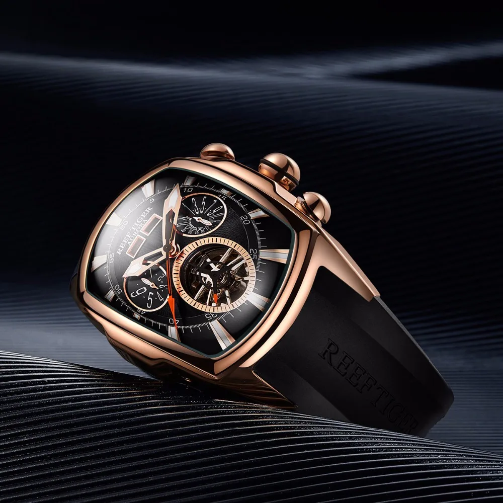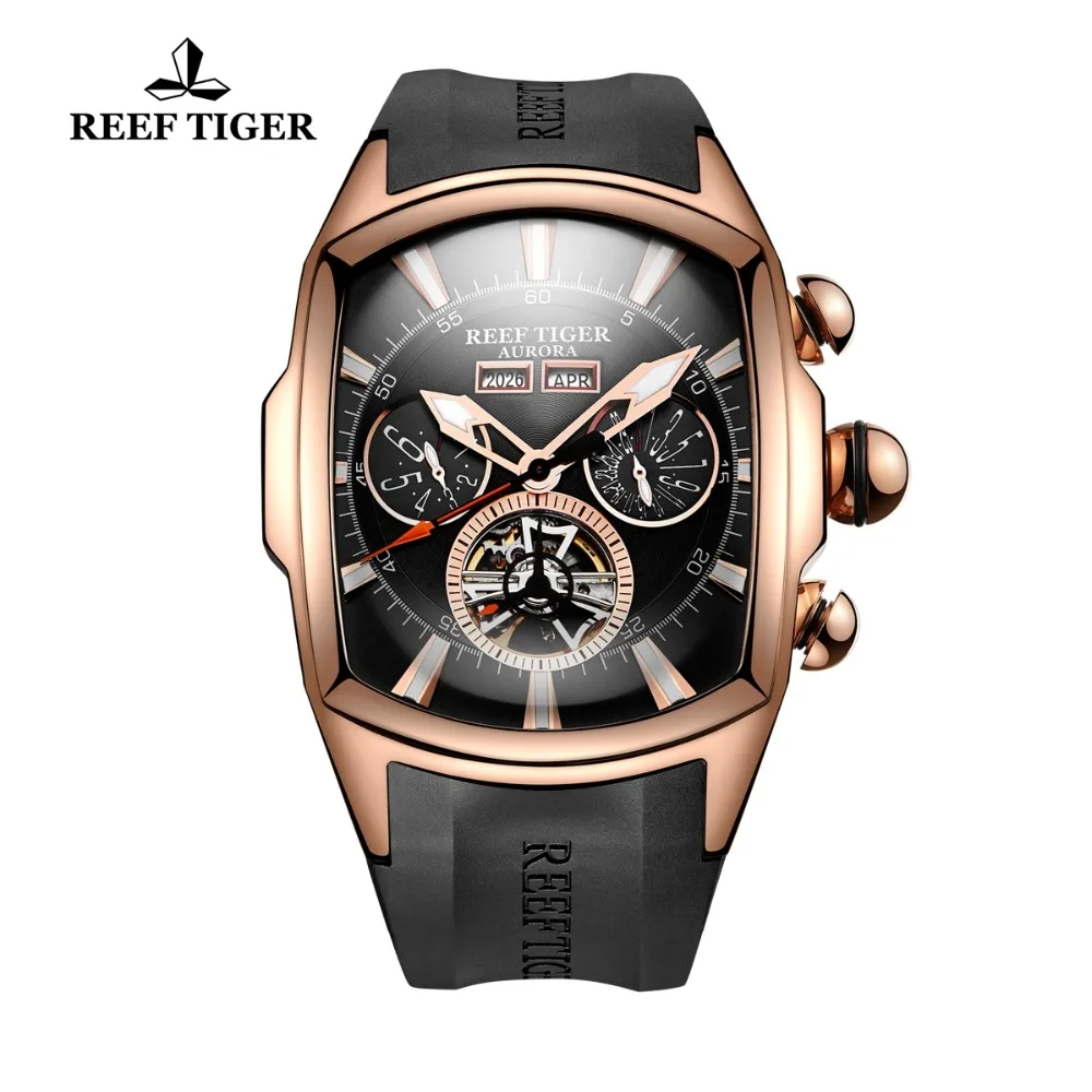 Reef Tiger/RT Luxury Rose Gold Watches Rubber Strap Men's Tourbillon Analog Automatic Watch Sport W
