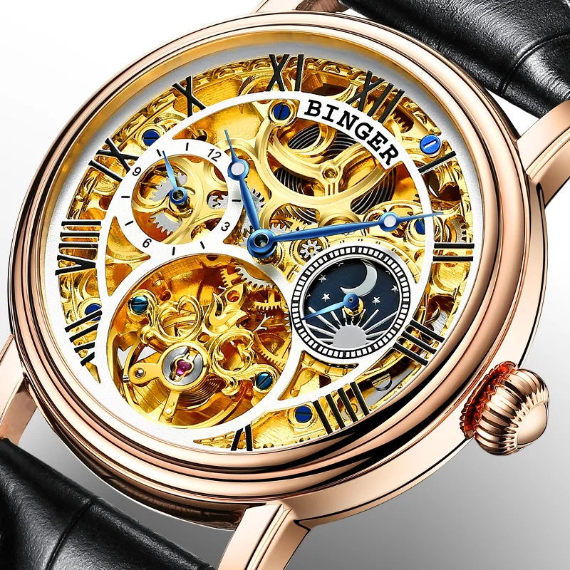 BEST SELLER Switzerland BINGER Men Watch Big Mechanical Watch tourbillon Leather Strap Moon phase Sapphire Wate