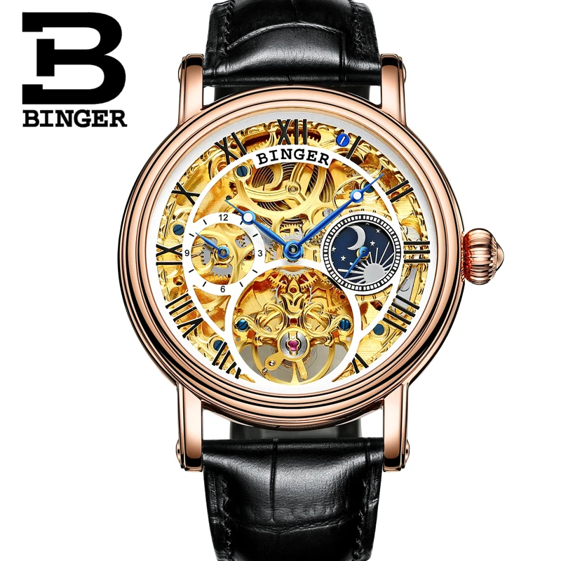 Switzerland BINGER Men Watch Big Mechanical Watch tourbillon Leather Strap Moon phase Sapphire Wate