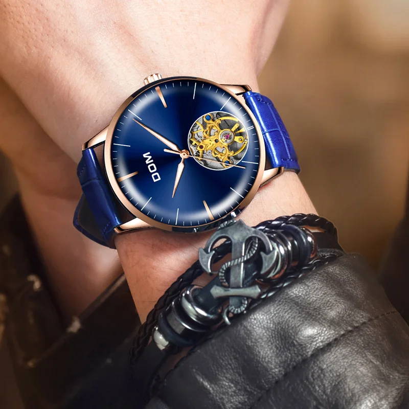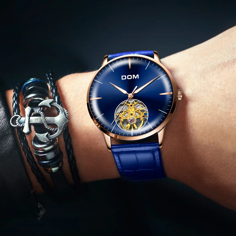 DOM Luxury Brand Watch Men Automatic Self-Wind Blue Leather Strap 3ATM Waterproof Mechanical Watch